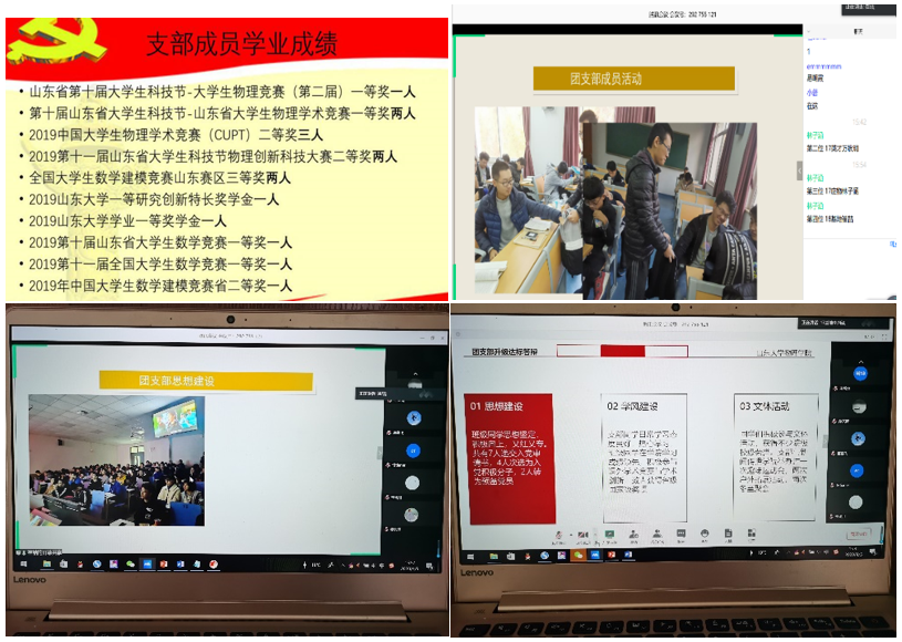 答辩开始前,主持人介绍了学院团支部“达标升级”的工作要求、先进团支部的评选标准、线上答辩的打分办法等相关事项。随后,答辩环节正式开始。本科2017级、2018级、2019级、2016级团支部,硕士2018级、2019级、2017级团支部和博士团支部依次进行了线上答辩。各位团支书展示了本支部的基本情况及团支部2019年的学习成果、文体活动的开展情况等,此外还着重介绍了支部成员取得的各项荣誉和成绩。本科2017级、2018级团支部建设成果尤为突出,不仅在学业方面成绩优异,而且在各种活动的组织与开展方面也十分丰富多彩。此外,本科2016级及硕博团支部也展现了支部同学们积极的学习、生活态度和不断进取的精神,分享了在团支部建设方面取得的成绩。作为2019年新成立的团支部,2019级团支部也在努力向优秀团支部看齐,在抓好学风建设的同时积极组织各项活动。