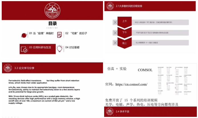 因为突如其来的新冠疫情,所有同学都在居家学习、生活。为进一步帮助大家明确学习、工作计划,2019级物理学硕士班团支部的成员发起了线上视频交流会。2017级硕士王晨曦以自身为例,从三个方面为我们讲述了他自己的学习过程与升学经历,使我们对研究生生活有了整体的了解,帮助我们更好地调节居家隔离的心理状况以及规划疫情期间及之后的学习生活。在疫情期间,家中学习确实不如在学校便捷,但是我们万万不可因无法按时返校而荒废学业,在家中也要保持良好的作息,制定一个合理的学习计划,保持积极向上的心态,勇敢地面对困难。