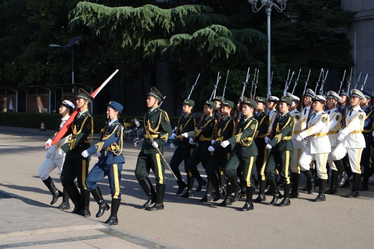 上午7时,升旗仪式准时正式开始。广大青年团员庄严肃立,注视着国旗护卫队昂扬前行。护卫队的全体队员精神饱满、昂首挺胸,步伐铿锵有力,他们护卫着国旗坚定地走向升旗台。在集体慷慨激昂的国歌声中,鲜红的国旗在光明的广场上冉冉升起、随风飘扬,爱国爱党、荣校荣院之情涌上学子心头。