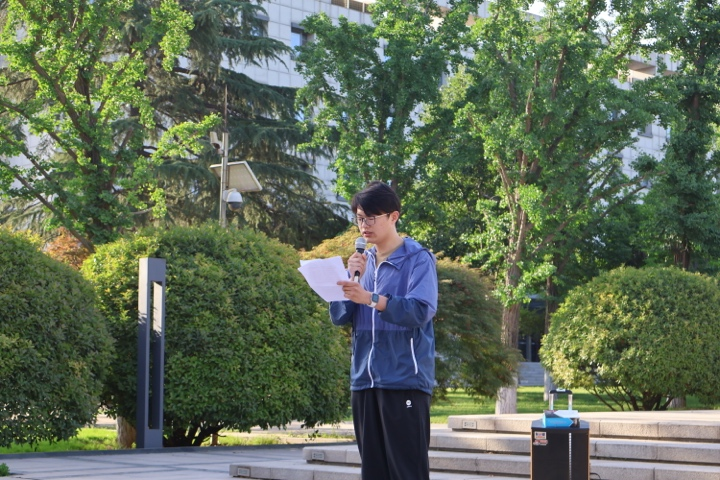 随后,优秀团员2022级应用物理班的朱君豪同学代表全院团员同学发言,他演讲的主题是《永远跟党走,致胜新征程》。“红日初升,其道大光。前途似海,来日方长。”愿吾辈学子坚定信念、明确担当、脚踏实地、一往无前,让我们用奋斗为民族复兴铺路架桥,用奉献为祖国建设添砖加瓦,开启和制胜兴国、富国、强国崭新征程!随后,在2022级强基班优秀团员张鹤瀚同学领誓下,全体青年团员整齐列队,高举右拳,用强有力的嗓音重温入团誓词。