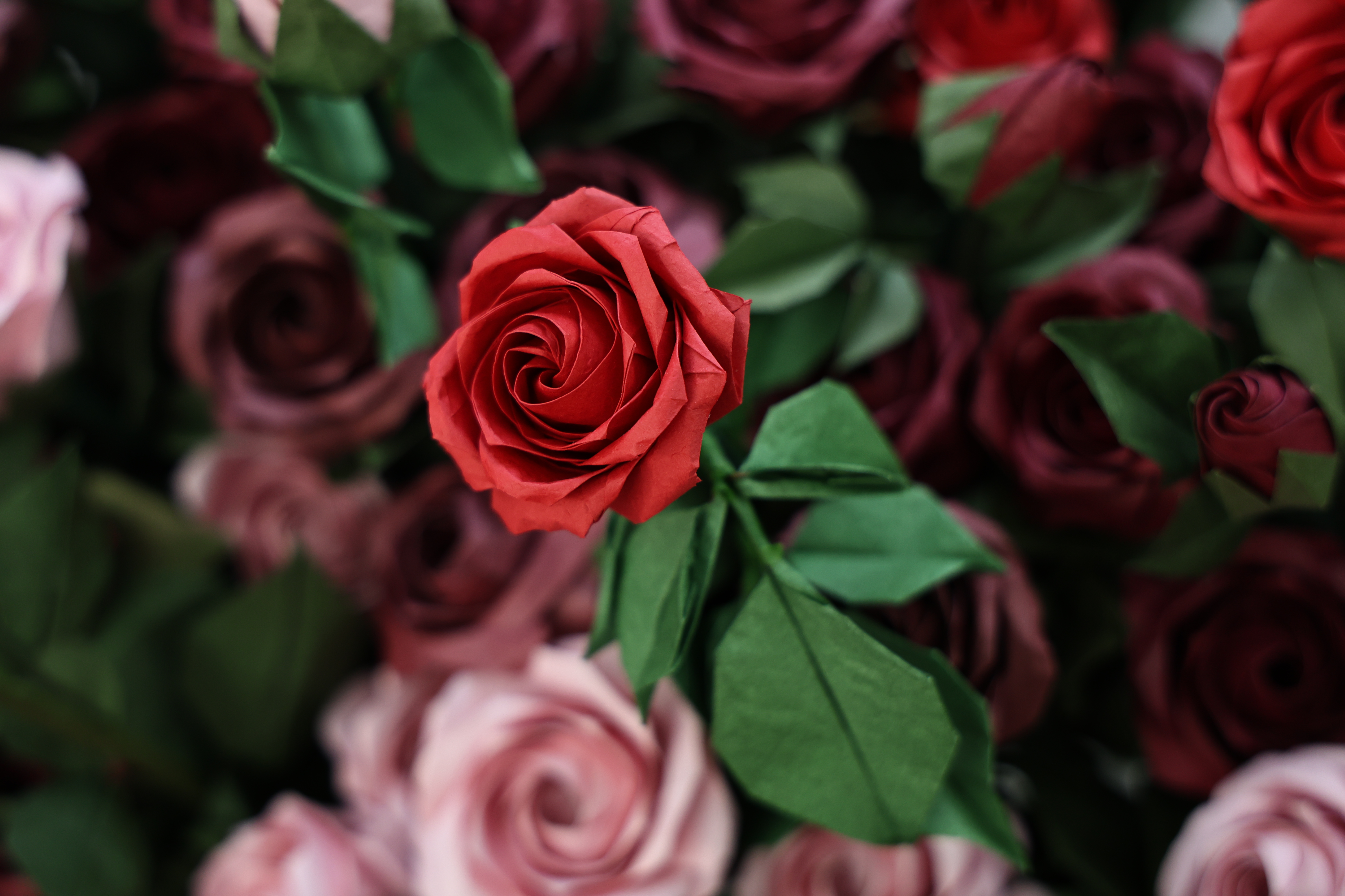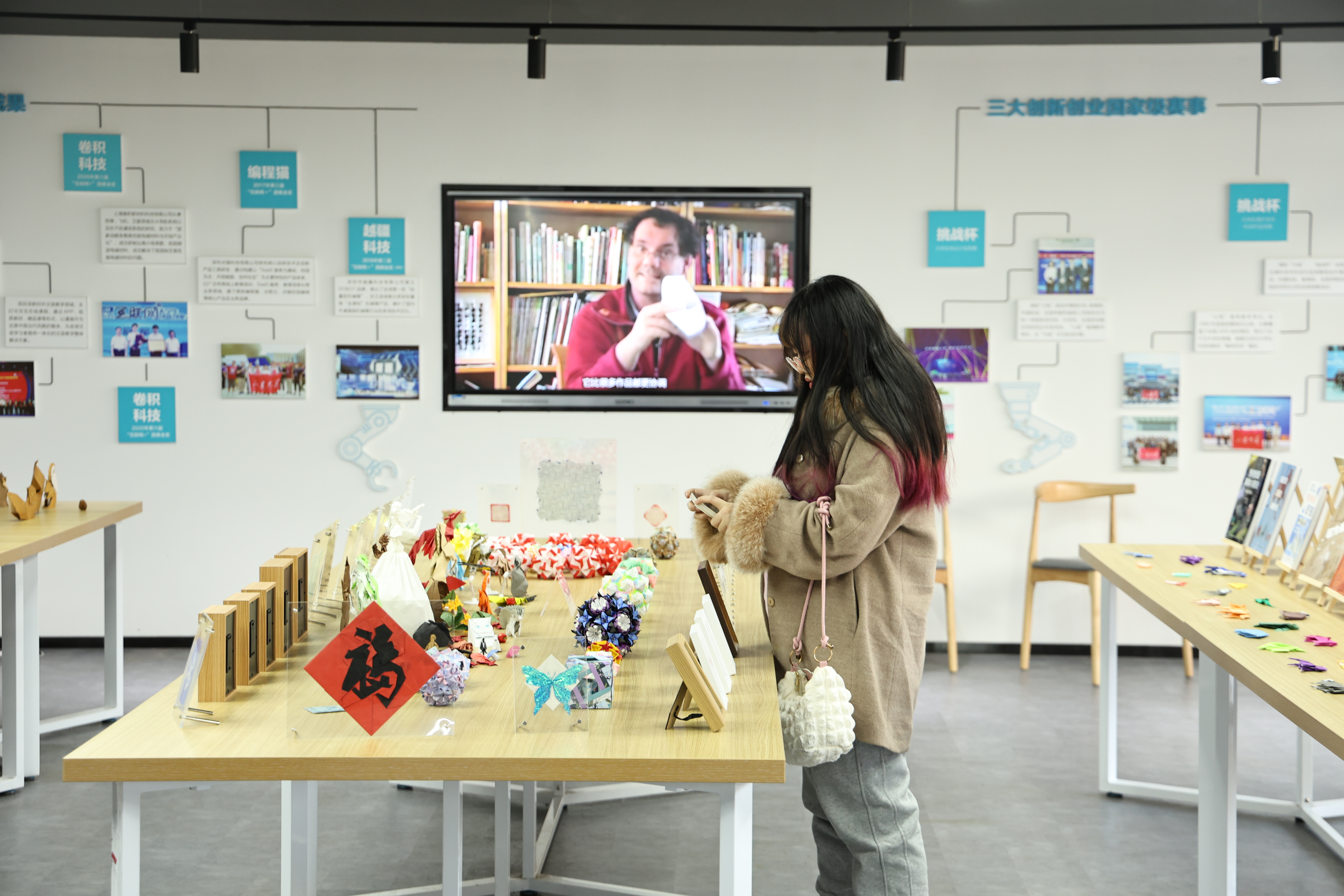 进入展厅,数百朵折纸玫瑰组成的春日花海令人驻足。展示区陈列了各类精美的折纸作品及专业折纸书籍,现场播放的折纸纪录片也吸引了许多人观看、讨论。打卡区则展示了巨型折纸蝴蝶与春燕,并悬挂出20余种特种纸张,结合特制灯光效果,为观众提供了独特的艺术体验;折纸太阳帽与玫瑰花束,则带领着现场观众实现沉浸式打卡。互动区内,社团成员组织开展的折纸体验活动吸引了众多参与者,观众可亲手体验从纸张到艺术品的创作过程,折纸风格的印章、钥匙扣等纪念品也备受青睐。