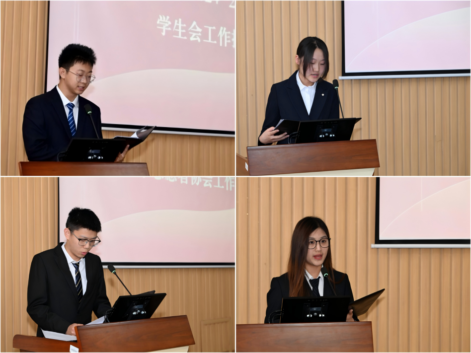 学生会主席曹文童、学生科学技术协会主席唐净如、青年志愿者协会主席李嘉恒向大会代表作2024—2025学年工作报告,全面回顾了过去一学年学院学生组织在组织改革、思想引领、学术学风、素质拓展、创新创业、志愿服务等各方面工作。青志协权益部主席张金鑫向大会代表作《开云网页版页面第五届学生代表大会提案征集情况报告》,详细汇报了会前征集的涵盖基础设施、制度办法、实验学习、日常生活等多方面提案。