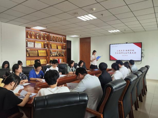 上午11时,在雄伟的国歌声中,研代会正式拉开帷幕。参会代表集体学习了2025年五四青年节习近平总书记给2025年度中国青年五四奖章集体、新疆克孜勒苏柯尔克孜自治州阿图什市哈拉峻乡谢依特小学戍边支教西部计划志愿者服务队全体队员的回信精神,聆听习近平总书记对广大青年的殷切嘱托。辛莹代表学院向大会的顺利召开表示了热烈的祝贺,并对过去一学年学院研究生会在思想引领、学术创新、五育融合等方面取得的显著成效给予了充分肯定,并向全体研代会代表、研究生干部及即将当选的新一届研会主席团成员提出了做理想信念的“引领者”、做科研报国的“践行者”、做创新协同的“催化剂”、做精准服务的“护航员”的四点要求,勉励物院研会成员及青年学子为强国建设和山大发展贡献“物院力量”。