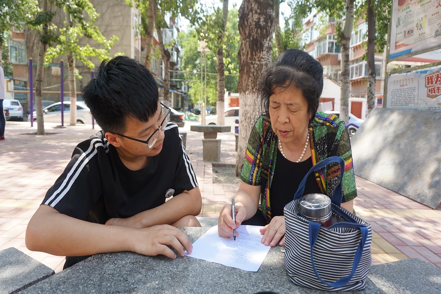 随后,Star 调研团在小型健身广场处设立了易拉宝海报等宣传用品,调研团成员对在社区内活动的老人和年轻人随机就社区基础建设问题进行了问卷调查和访谈。